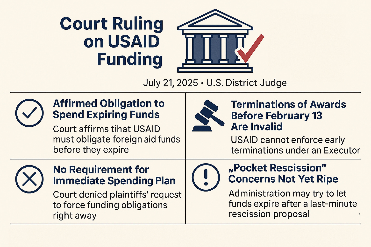 The court ordered agencies to obligate all expiring FY24 foreign aid funds and blocked the termination of 462 contracts and grants that were canceled between January 20 and February 13.